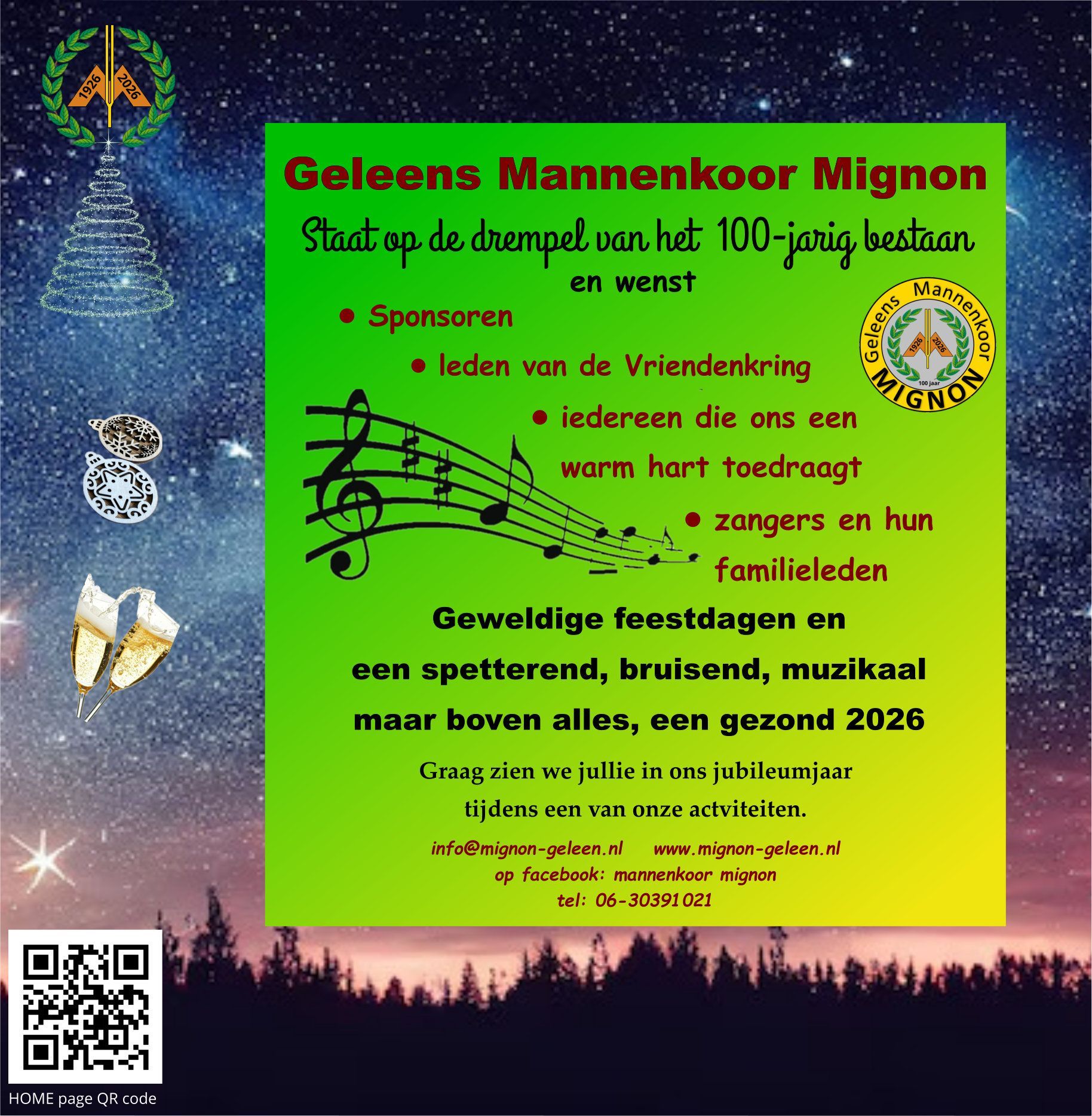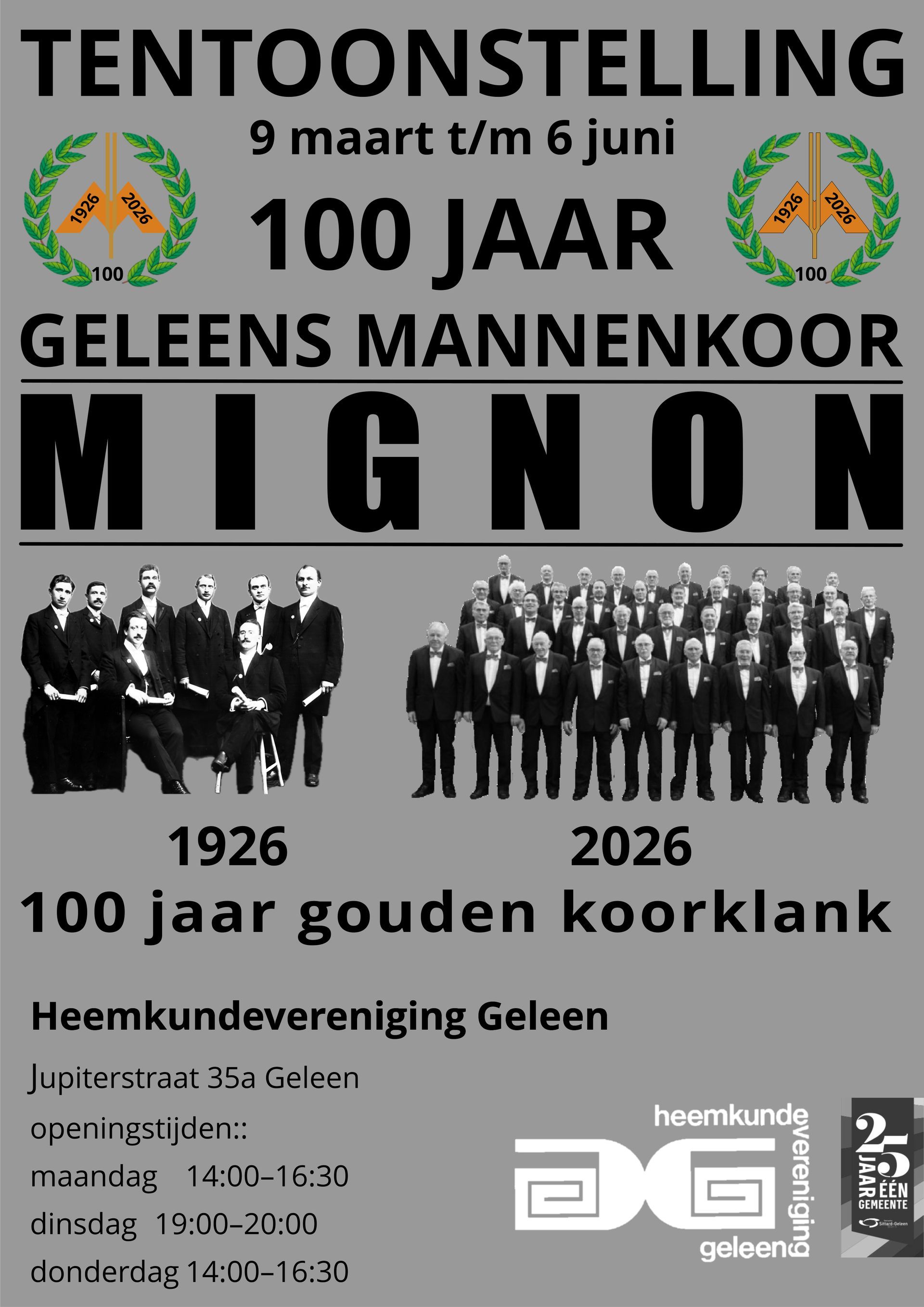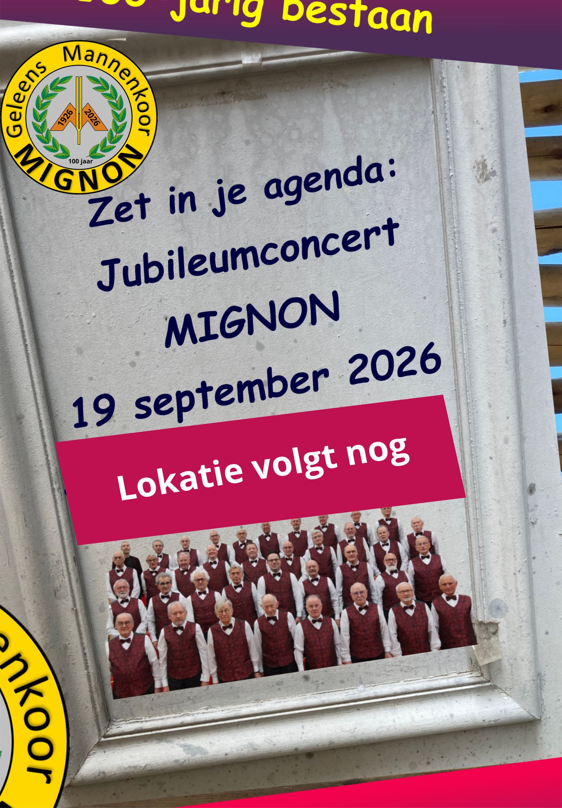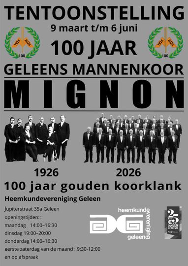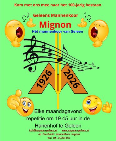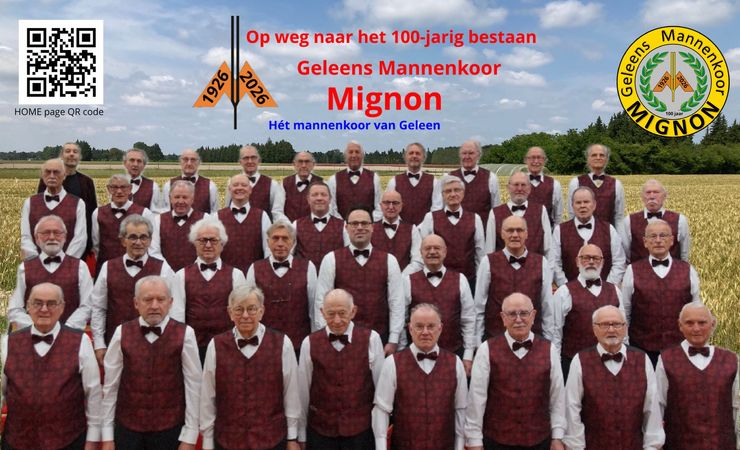 Het Geleens Mannenkoor Mignon is opgericht op 1 februari 1926, en in 2026 vieren we ons honderdjarig bestaan! Sinds de oprichting heeft ons koor talloze concerten gegeven en concertreizen gemaakt naar onder andere Rome en Zwitserland.