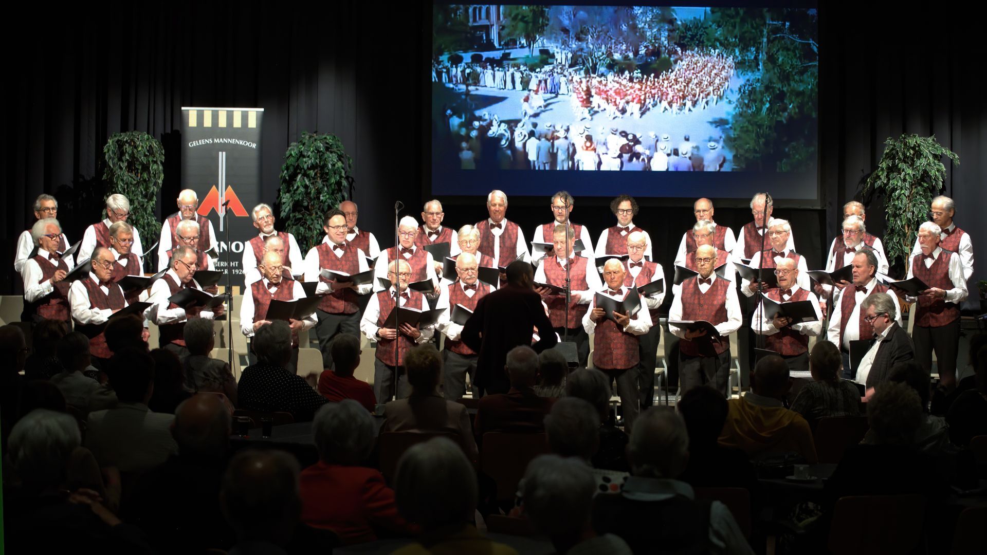 De sfeer was prima mede door het grote videoscherm achter het koor. Op dit scherm werden bij de muziek passende beelden vertoond. De beelden en aankondigingen werden gemaakt door Ad Keulers.
