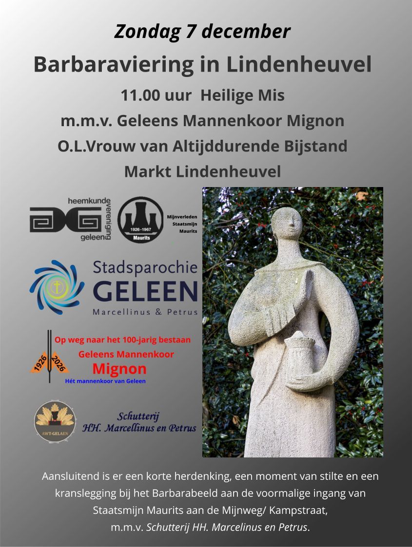 7 december hebben we de Barbaraviering om 11.00 uur in de kerk van Lindenheuvel opgeluisterd. Na afloop hebben een aantal leden het Barbarabeeld bezocht waar een indrukwekkend plechtigheid plaatsvond.
