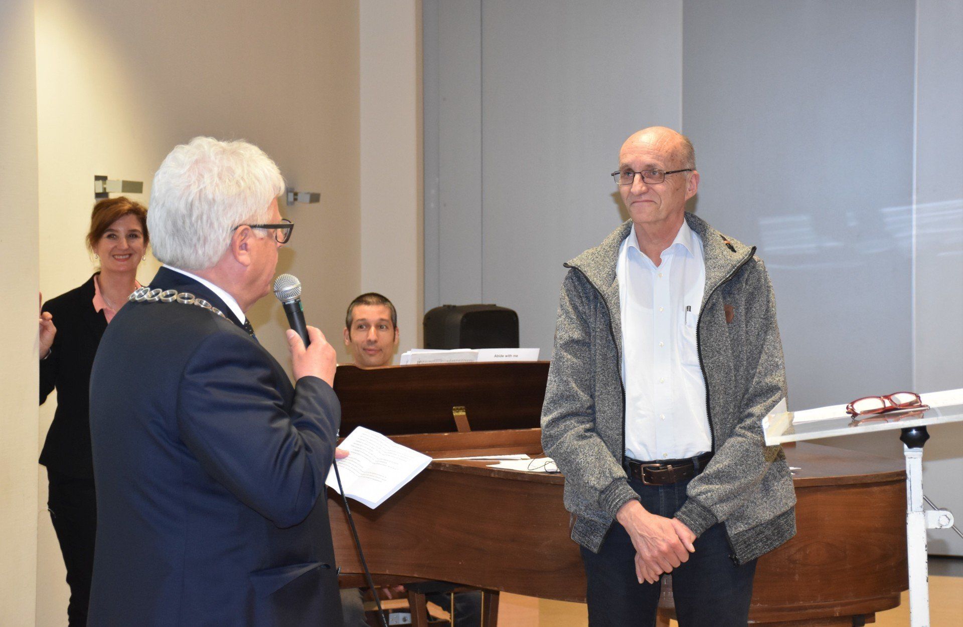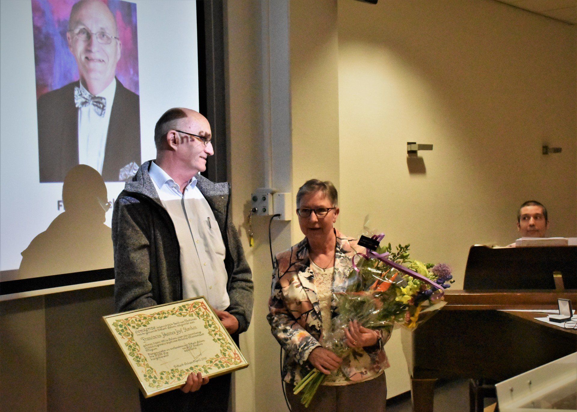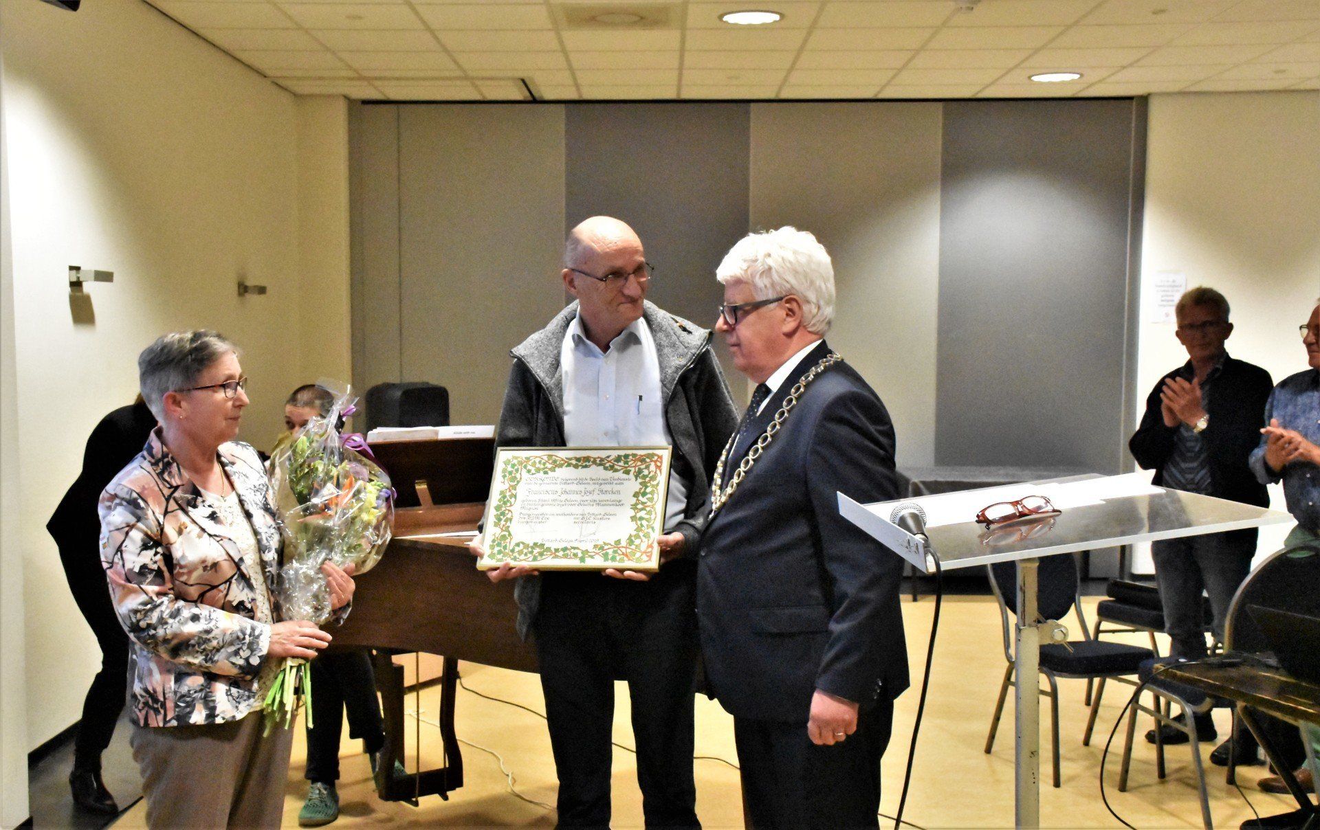 Op maandag 20 mei 2019 is tijdens de repetitie van ons koor onze 2e secretaris Frans Storcken gehuldigd door Burgemeester Sjraar Cox. Hij kreeg door de burgemeester de Erespeld van de gemeente Sittard-Geleen uitgereikt.