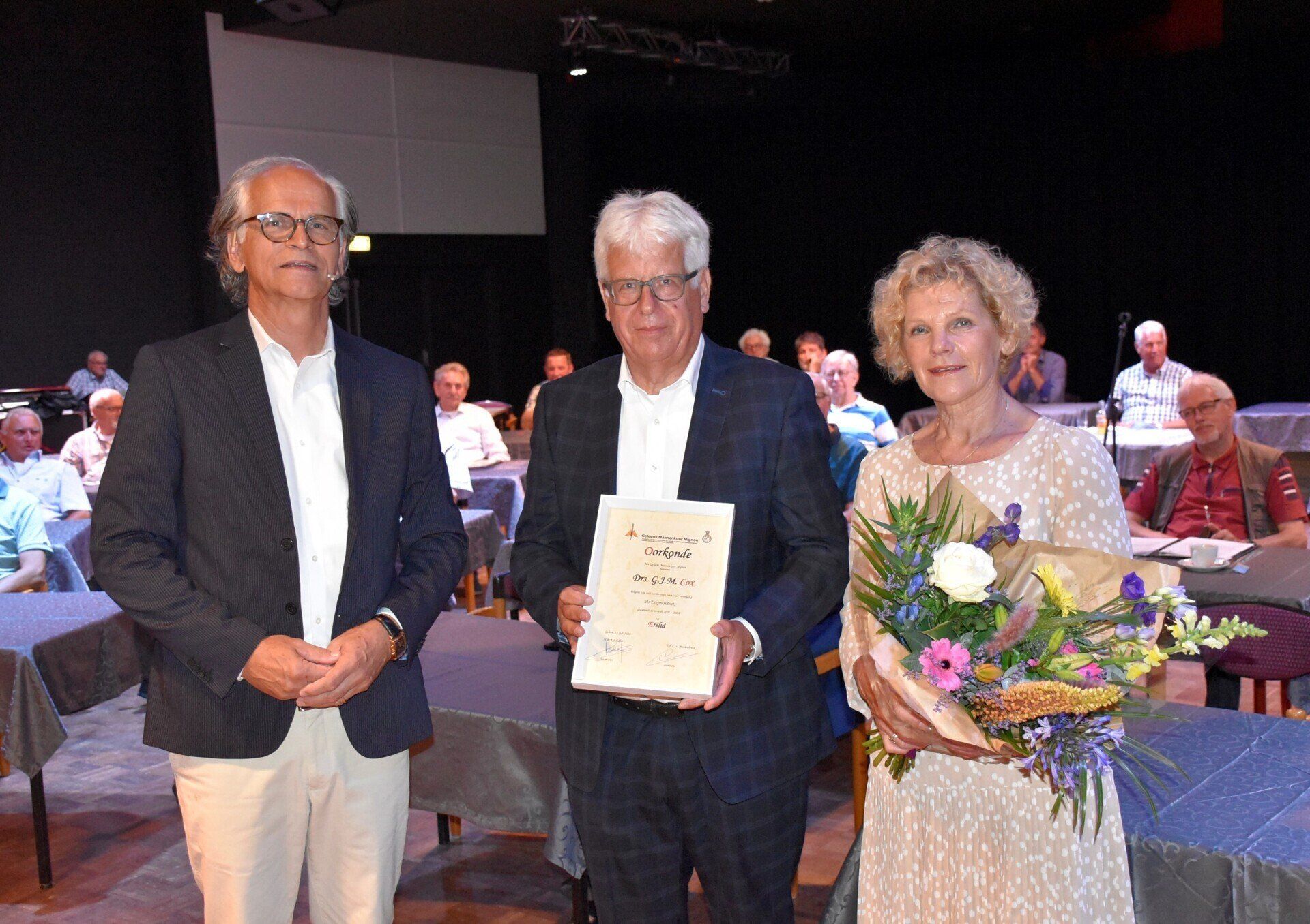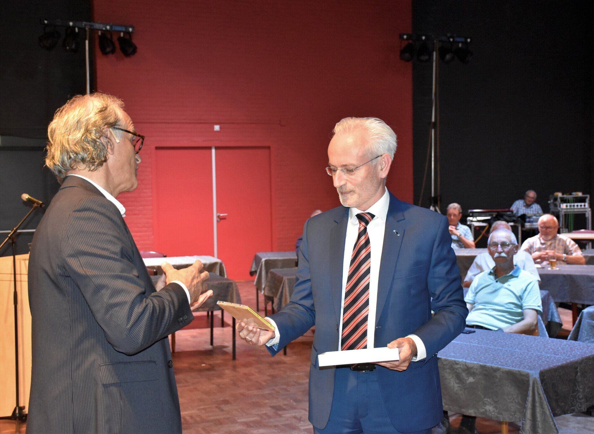 De hamvraag was natuurlijk of onze nieuwe burgemeester bereid zou zijn om deze mooie taak ten dienste van Mignon op zich te nemen. Maar snel bleek, dat bij de functieoverdracht van burgemeester Sjra Cox aan zijn opvolger Hans Verheijen dit item duidelijk in positieve zin was besproken. Want toen onze vicevoorzitter Ben Ketelslegers aan onze nieuwe burgemeester de vraag stelde of hij deze taak op zich zou willen nemen, was dit geen verrassing meer en werd zonder enige terughoudendheid de vraag positief beantwoord. Voorzitter Huub Schäfer heeft burgemeester Hans Verheijen tijdens de jaarvergadering in De Hanenhof op 13 juli 2019 j.l. als nieuwe Erepresident benoemd en hij heeft hem bij zijn benoeming enige CD’s van Mignon cadeau gedaan. Burgemeester sprak na zijn benoeming de leden kort toe en noemde zijn benoeming in zijn toespraak ‘eervol’.